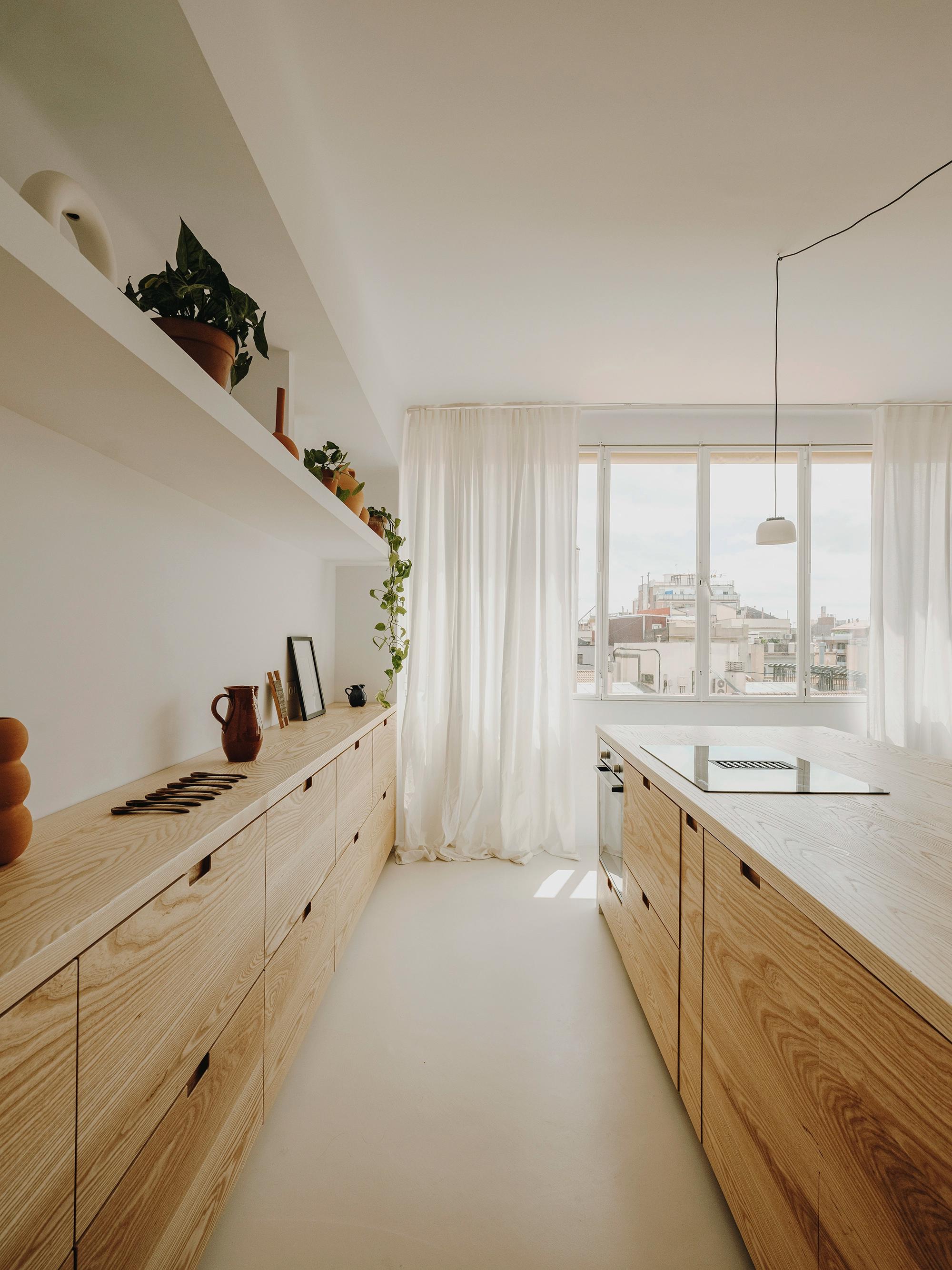 The open kitchen is located next to the large windows and as a backdrop to the house. We wanted a very open space that generates communication. The kitchen consists of a large central island with an ash wood countertop where the sink and stove are located. The extraction fan is located on the cooktop, eliminating any visual element between the kitchen and the dining room. Behind the island there is an auxiliary wooden cabinet under a large shelf full of objects from the different journeys. The lamps are the Heat Hat from Santa&Cole and the stools are the Nuta from Mobles 114. Between the island and the sofa we wanted something lightweight and flexible so we could move it around and turn the space into a small improvised dinner, so we kept the table from Santa Cole, and we reused the chairs we already had from AOO, the Salvador by Miguel Milà.