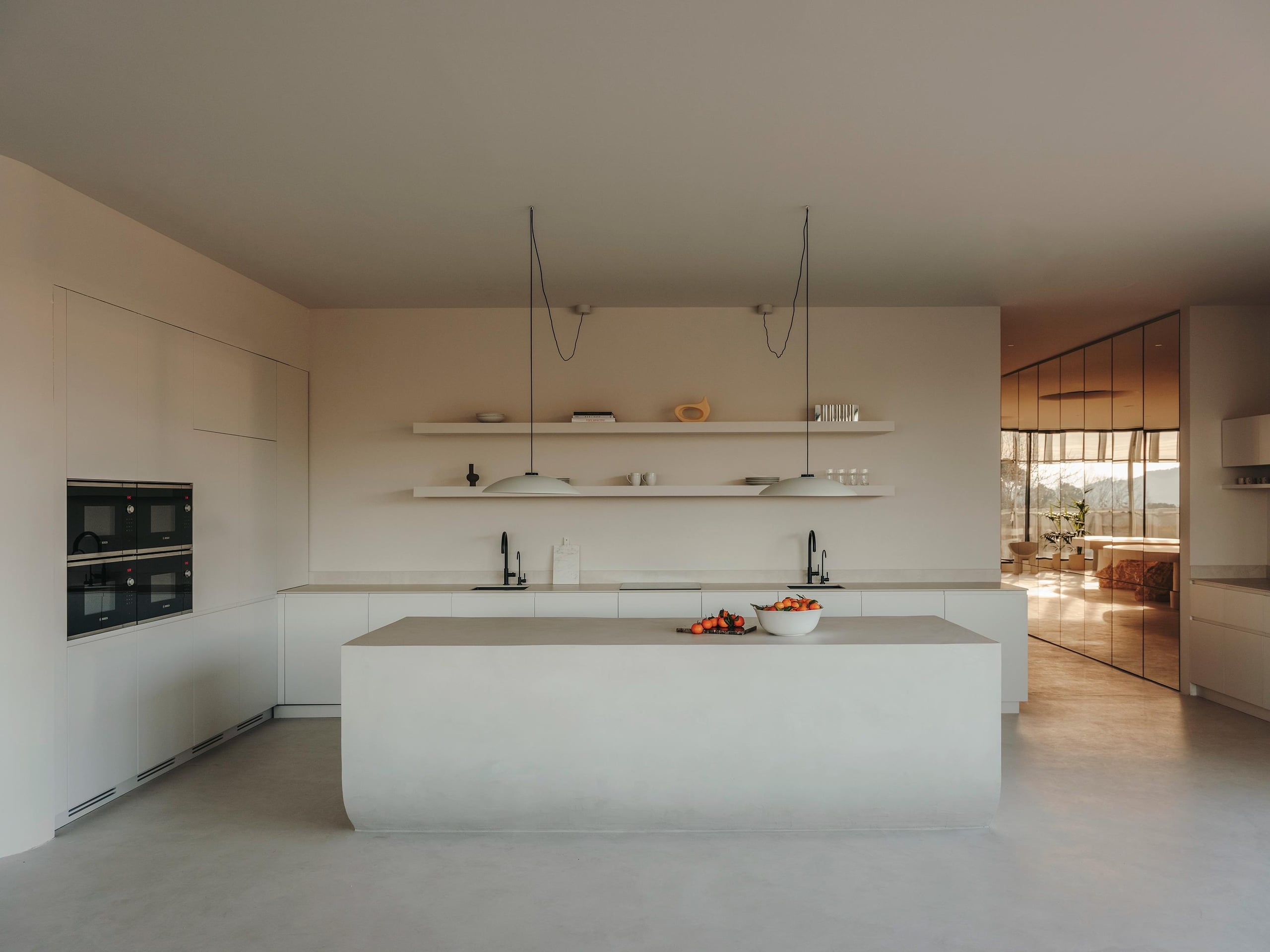 The kitchen was conceived as a meeting space, a serene space that reminds you of home, where you feel like being, and that encourages dialogue between people. A domestic and Mediterranean atmosphere encourages relaxation. A large concrete island finished in micro cement is the main element of the kitchen. The island was also conceived as a small sculptural element, generating a subtle curve in its front vertical plane. Head Hat lamps by Santa Cole illuminate the island.