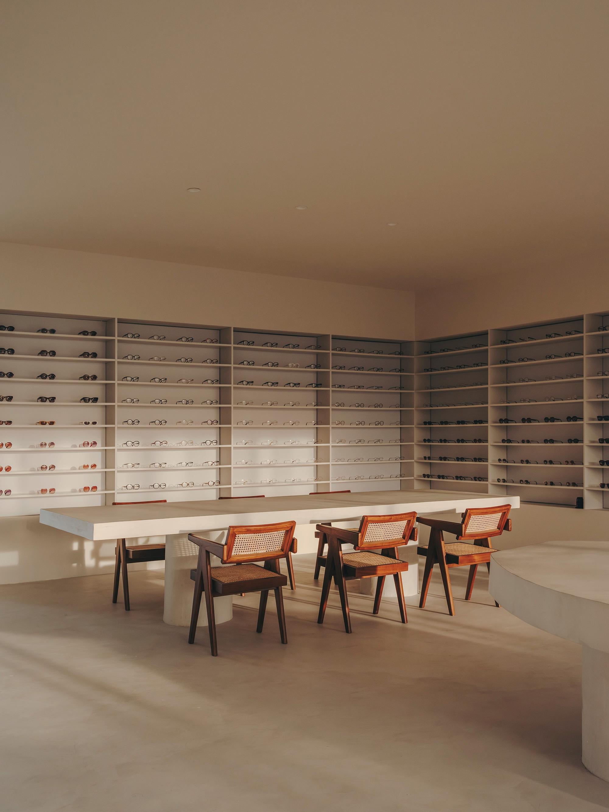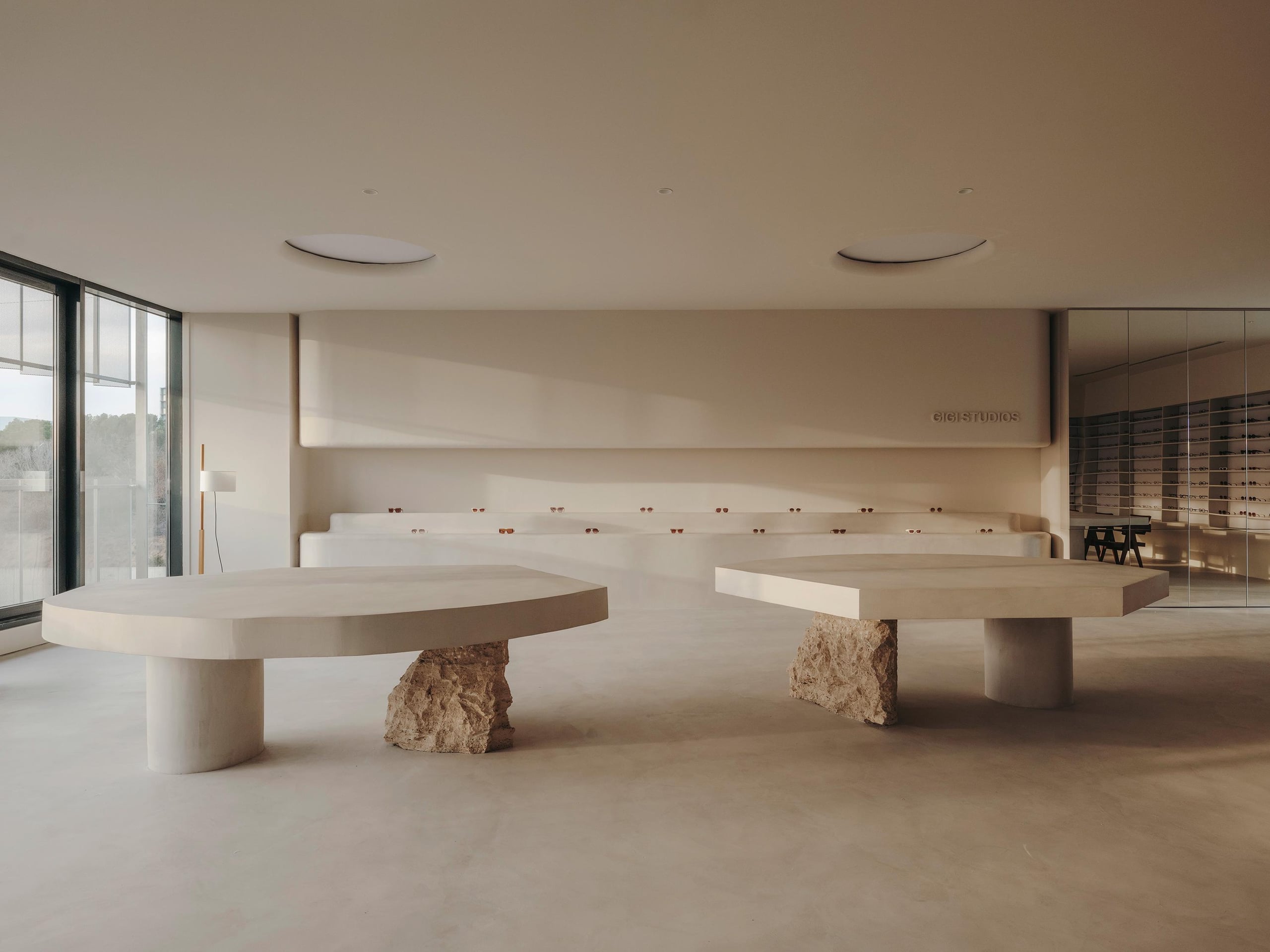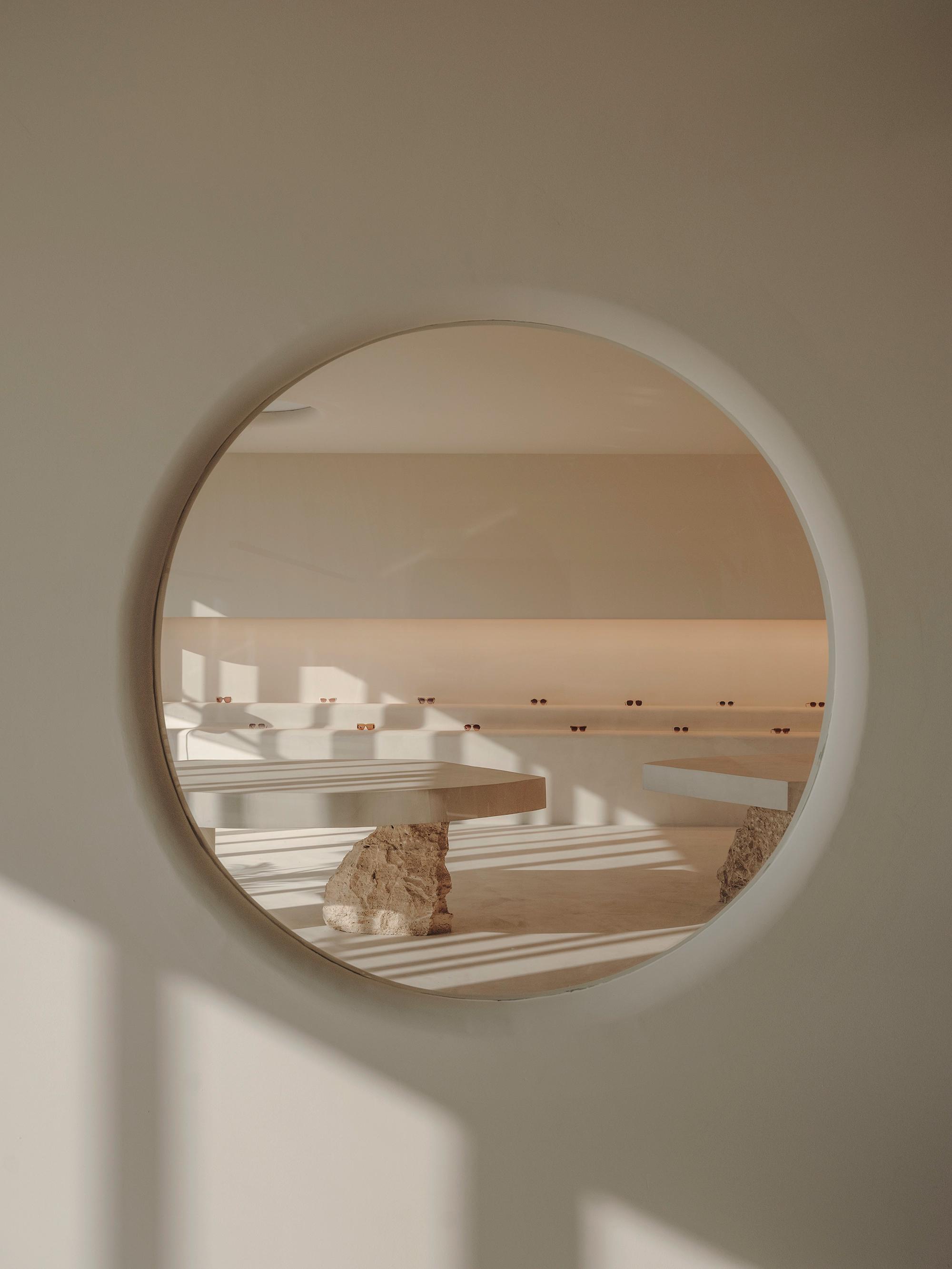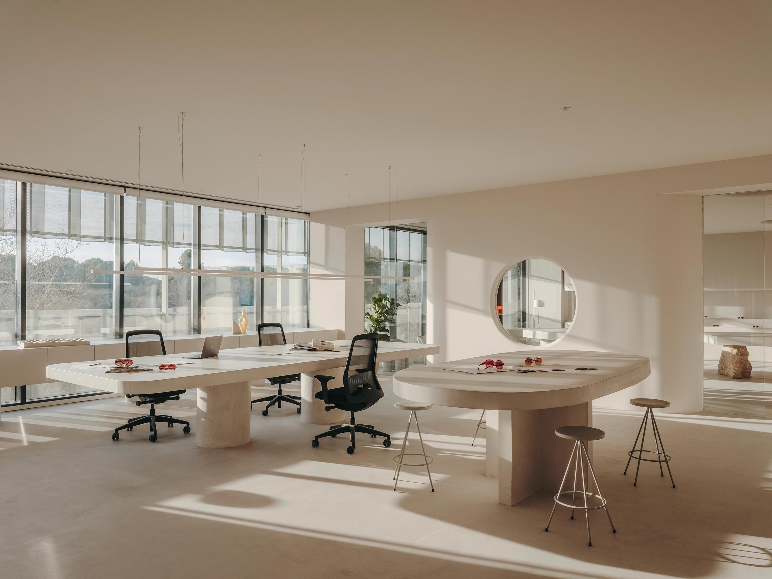 A circular opening with rounded edges gives a view of the showroom, the most singular space of the project. The space is divided into two areas: the exposition area and the meeting area. A minimalist atmosphere has been sought, giving centre stage to the glasses. Two large sculptural tables serve as a display for the product. The tables are made up of a concrete tabletop supported by a rock (Roman travertine) carved by the artists of the Barbany quarry. They are two pieces that crown the space and give it a unique character. On the ceiling, circular openings in the work give light to the space. In the background, there is a wall where a piece of furniture serves as a tiered display. On the facade, a set of chairs model Roly Poly by Driade is used for improvised meetings. The meeting area is created around a custom-designed table with chairs from Detjer. A backlit cabinet shows the rest of the collection. Another unique element is the mirror cabinet that hides a large screen.