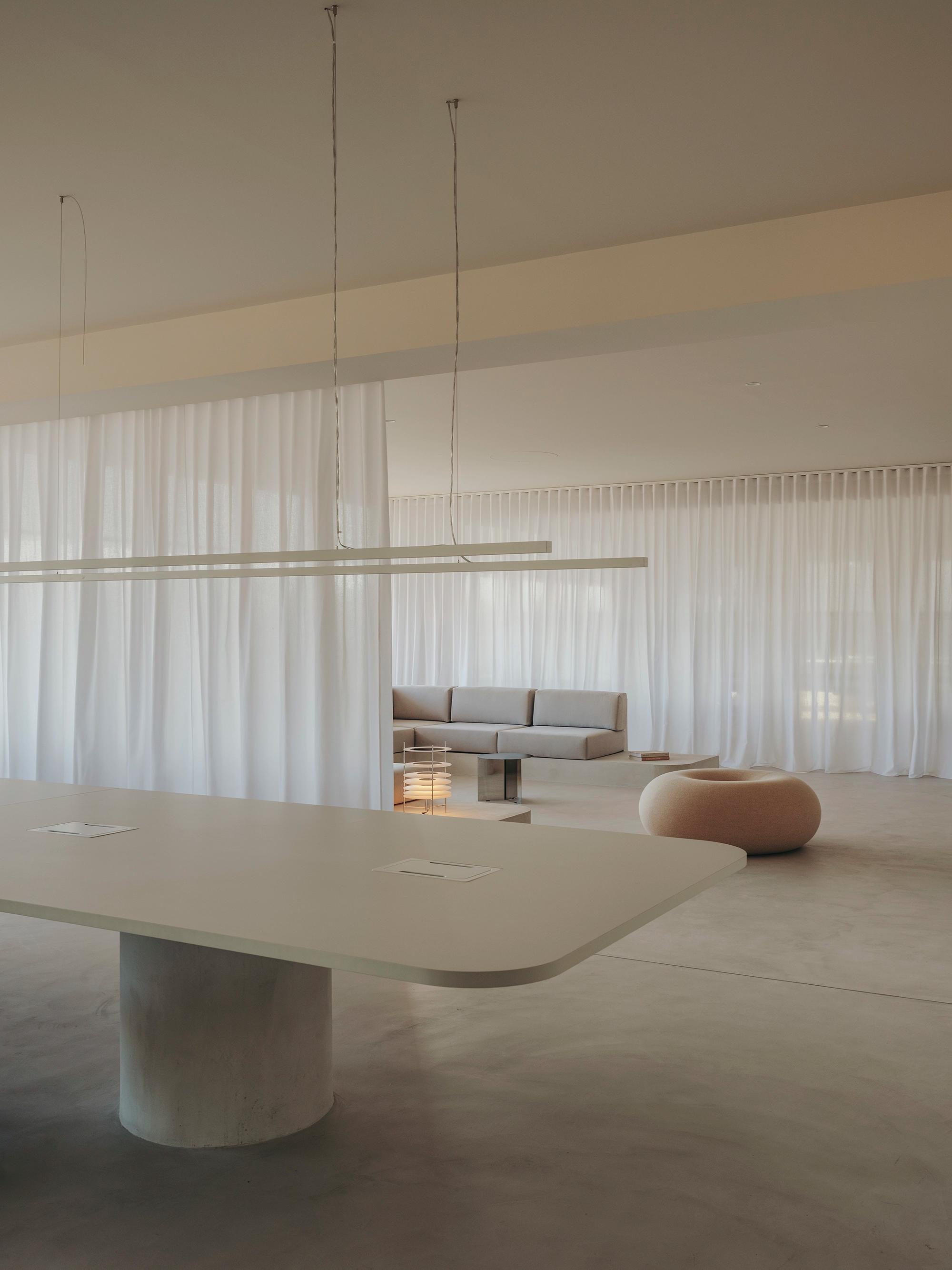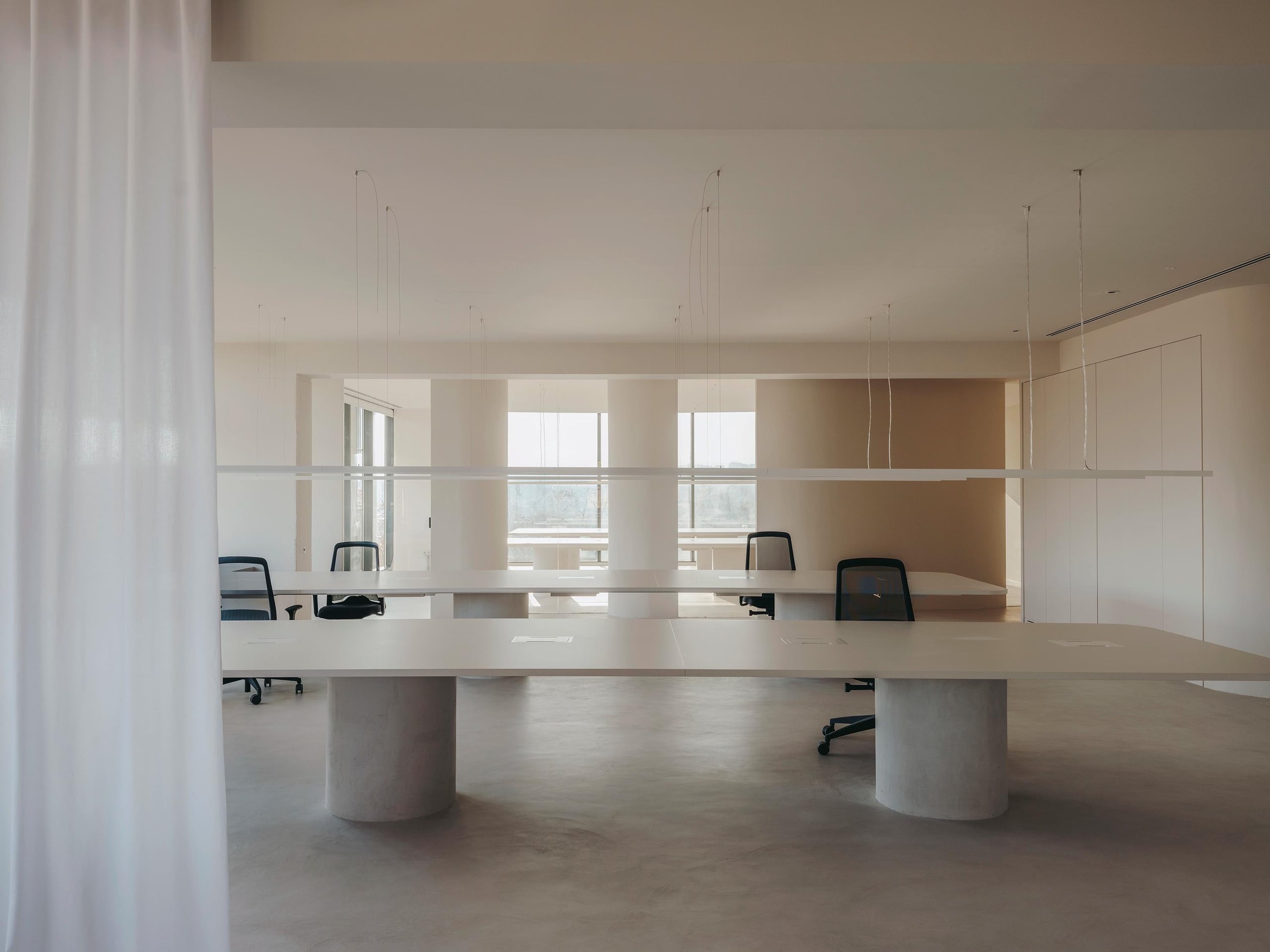 The office area has a curved tunnel where a niche sofa is integrated into the wall, giving access to the different offices. The offices are the only smaller enclosed spaces with the best views. Once inside, the architectural column helps to support the concrete table. An auxiliary piece of wooden furniture is used as a support for more personal elements. The Cesca chair is chosen for the table, and the Wassily chair by Knoll and the Bellhop lamp by Flos for a reading corner. The main meeting room has been designed to prioritise sunlight and views of the greenery. A large concrete table structures the space, and as a counterpart, looking for lightness but simultaneously a sculptural singularity, the FF CHAIR chair by Friends and Founders was chosen.