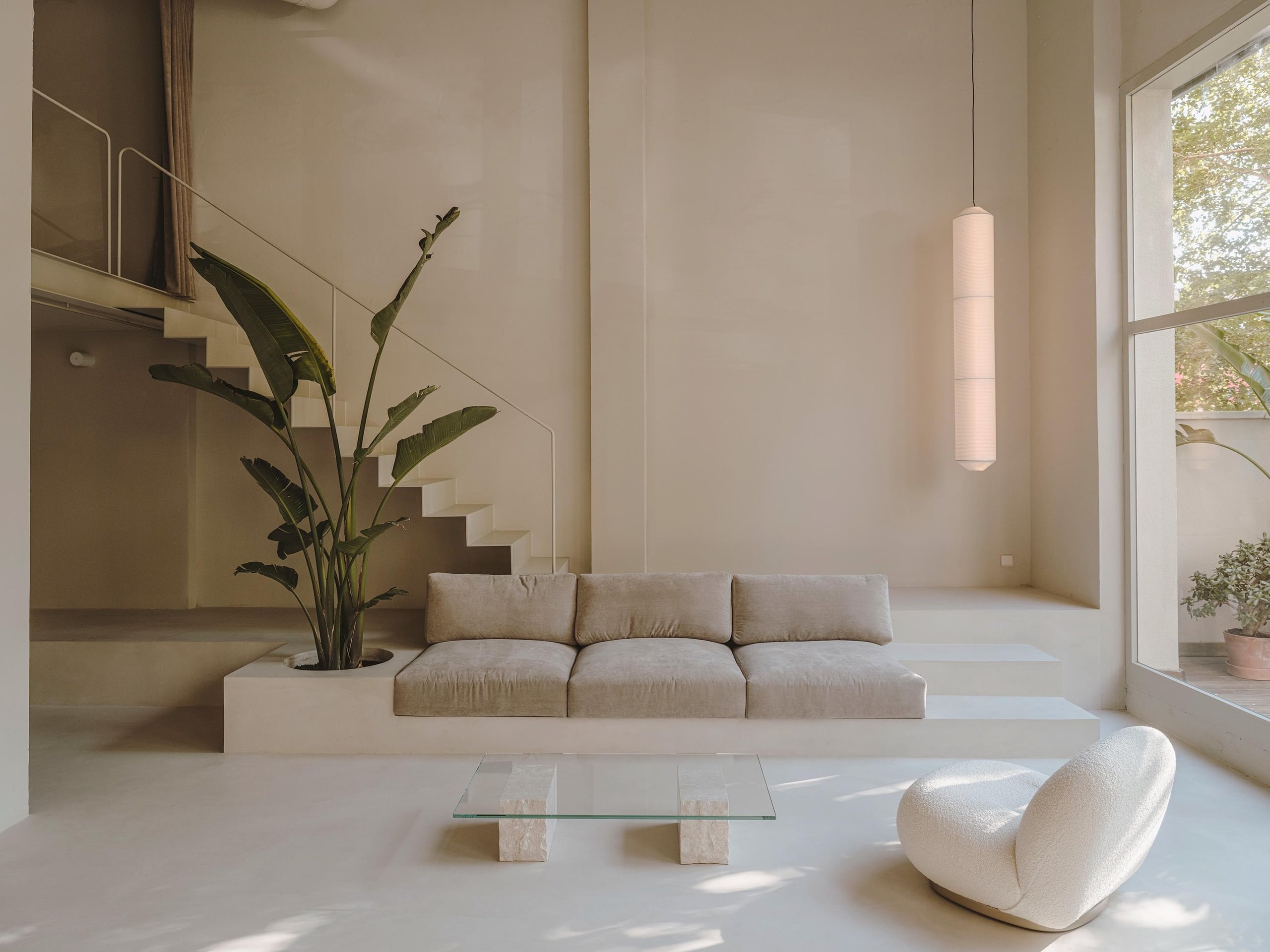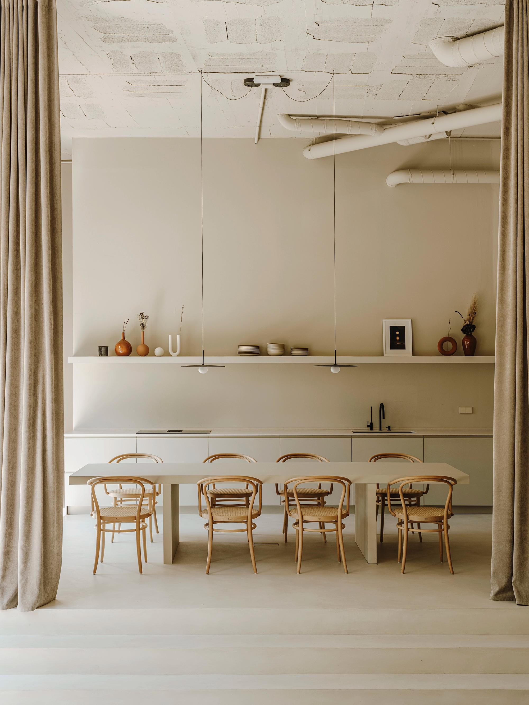 The private area is composed of the studio, the workshop, the leisure area, and the meeting room which is also the kitchen. All these spaces are connected to a large terrace, which in addition to giving beautiful views to a large planter full of plants. It also allows a very special evening sunlight to enter this space. The space was intended as a large architectural sanctuary where the imprint of craftsmanship was very present. The color earth was chosen to reinforce this idea of materiality and micro-cement is transformed on the floor and in the work elements and the walls with the same tone with an irregular plaster base. The loft can be closed with curtains at the top and at the bottom, thus not only providing different degrees of privacy but also providing an element to divide the different areas.