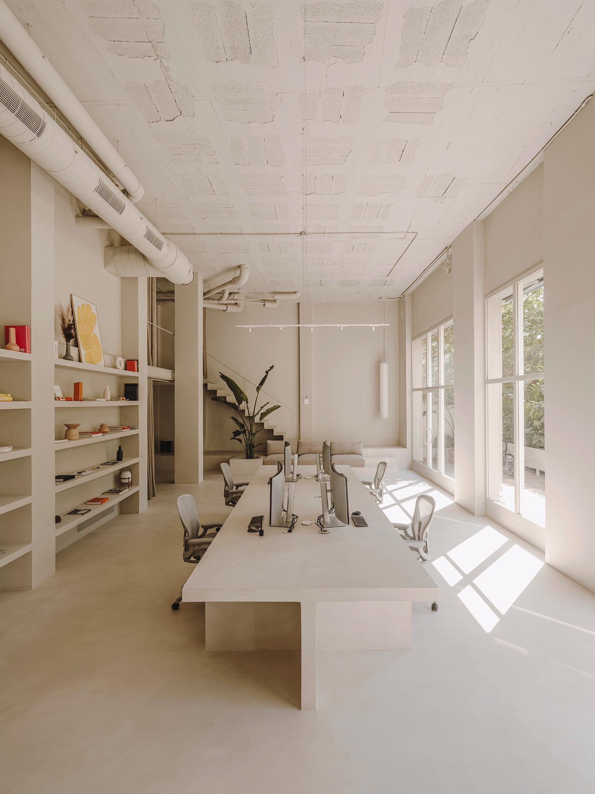 The project consists of the rehabilitation of a street level local to transform it into the new space of Ezequiel Pini and his creative studio Six N. Five. A space with multiple uses, mainly used as an office, but also as a showroom to exhibit objects. Adding an area for presentations, a small workshop to produce small prototypes, a leisure and virtual reality area, and also a specialized coffee area. In summary, a multidisciplinary space open to the city with small cultural proposals. The space is located in Barcelona, in Poblenou, in a first floor “L” shaped space with an extensive terrace at the back.