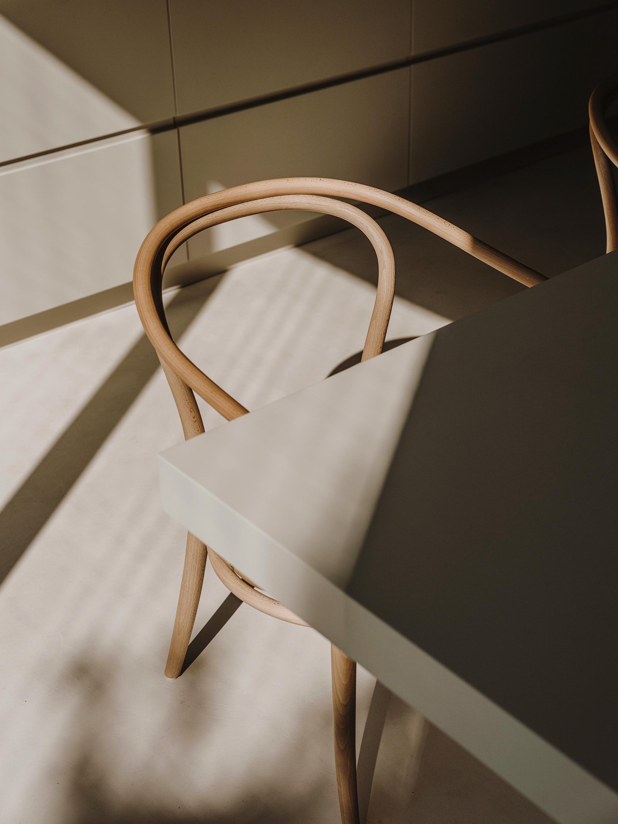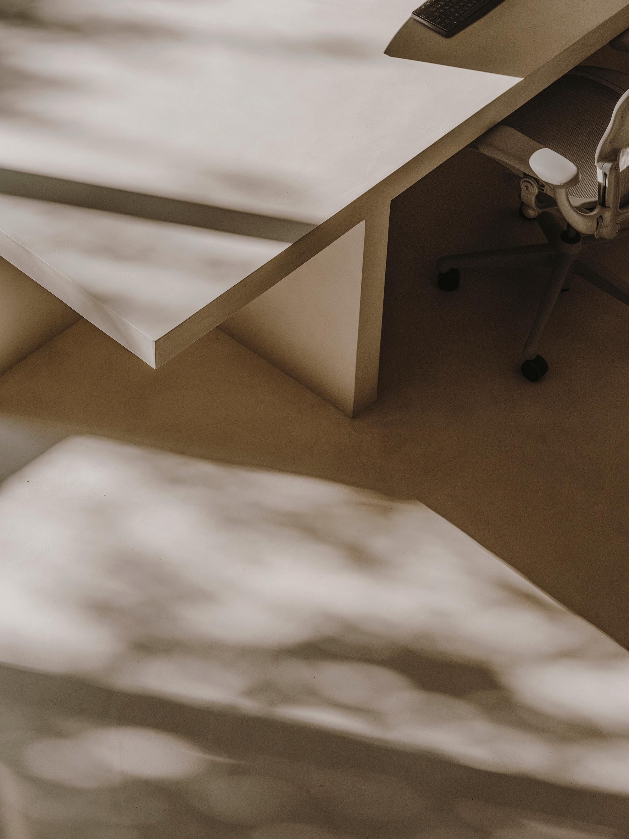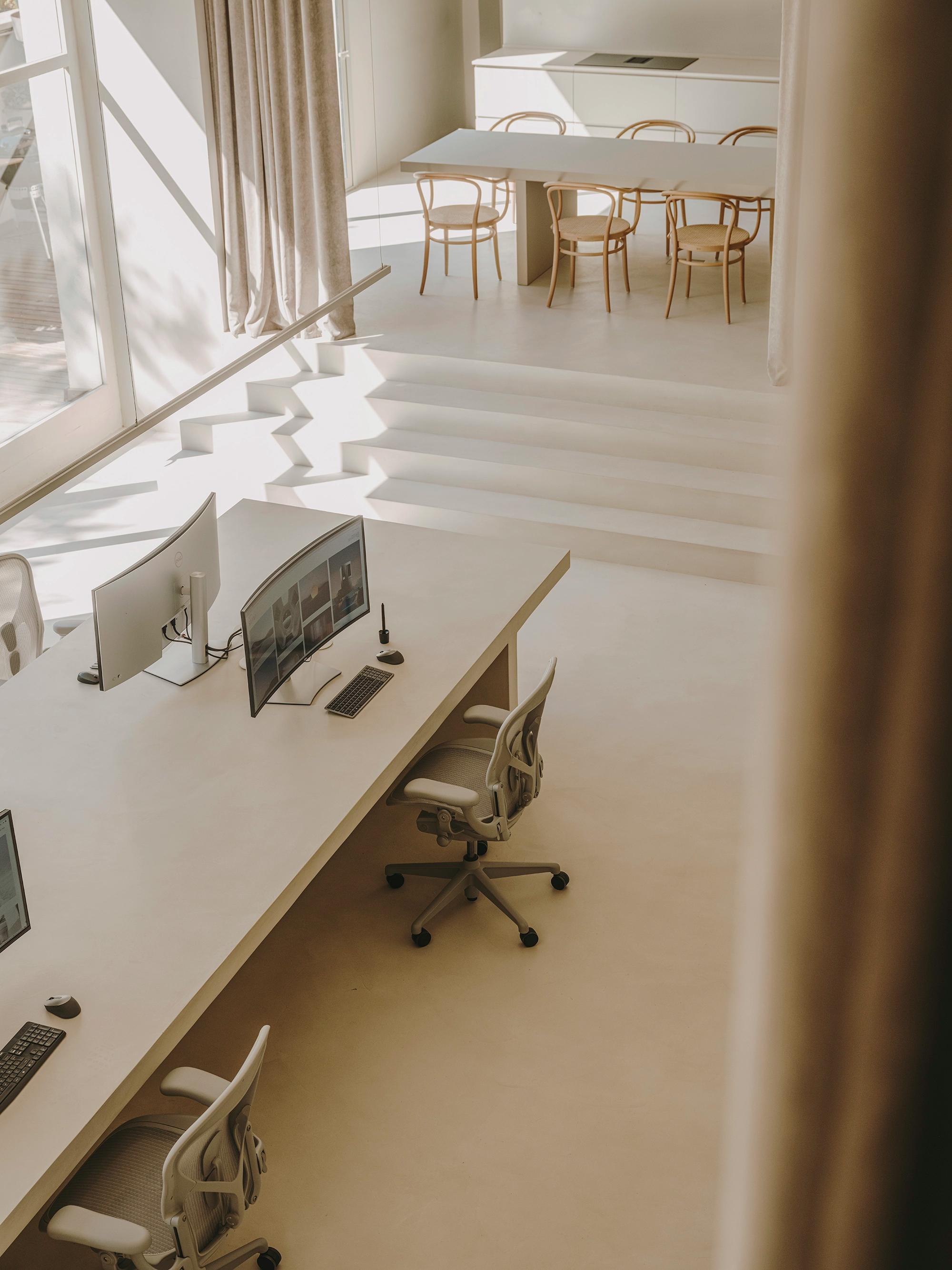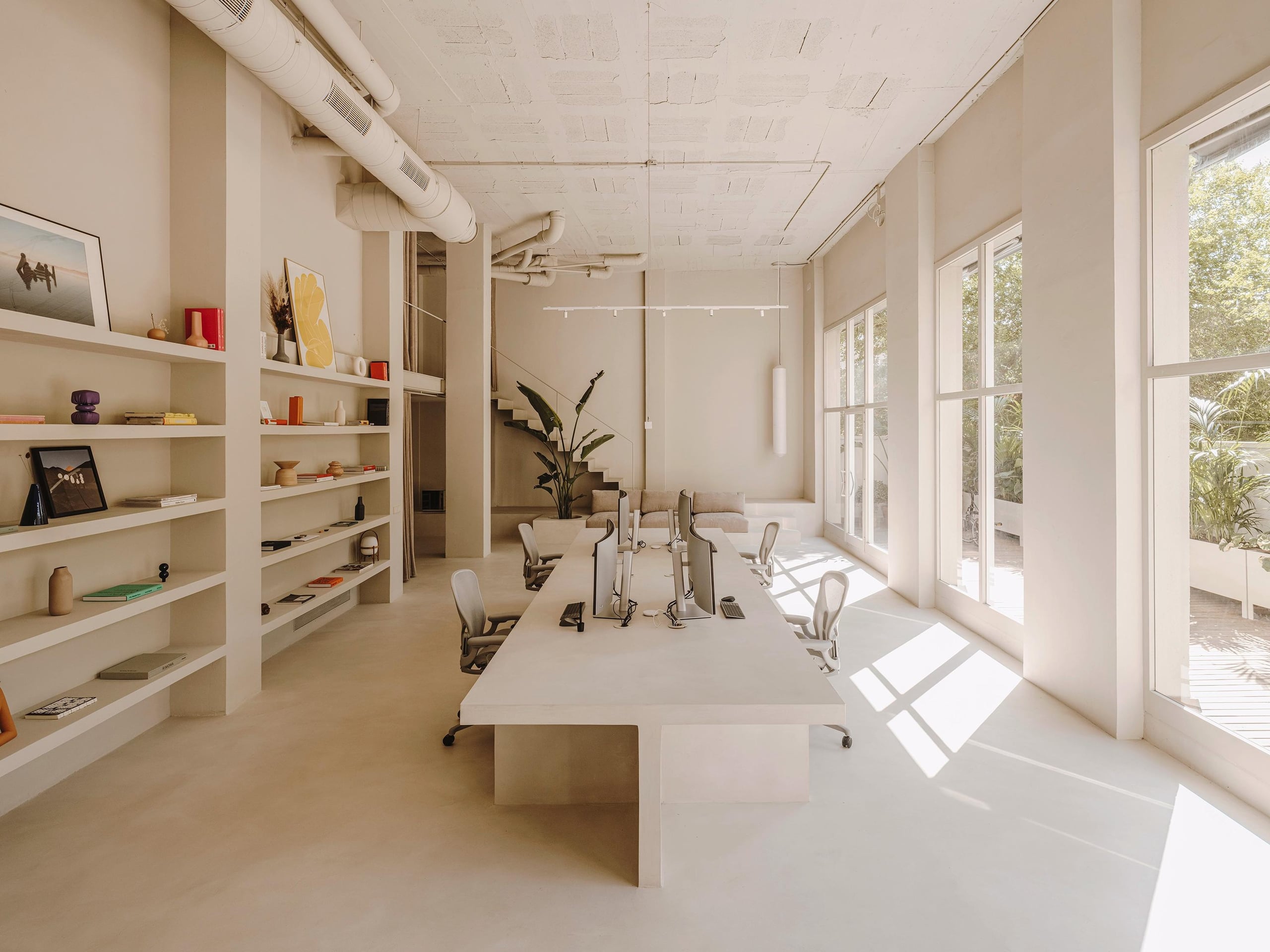 This space is structured around the large main table, finished with micro cement. An element made on site, which also reinforces the process and concept of craftsmanship above all. This table can accommodate up to six 3D artists, which with the computers in the rack area means that there are no cables and computers in sight. The chairs are Herman Miller's Aeron chairs. On the wall there is a large bookshelf, which looks great as a backdrop to the large workbench. Here there are books, prototypes and objects related to the work and inspiration and the imaginary world of Six N. Five.
