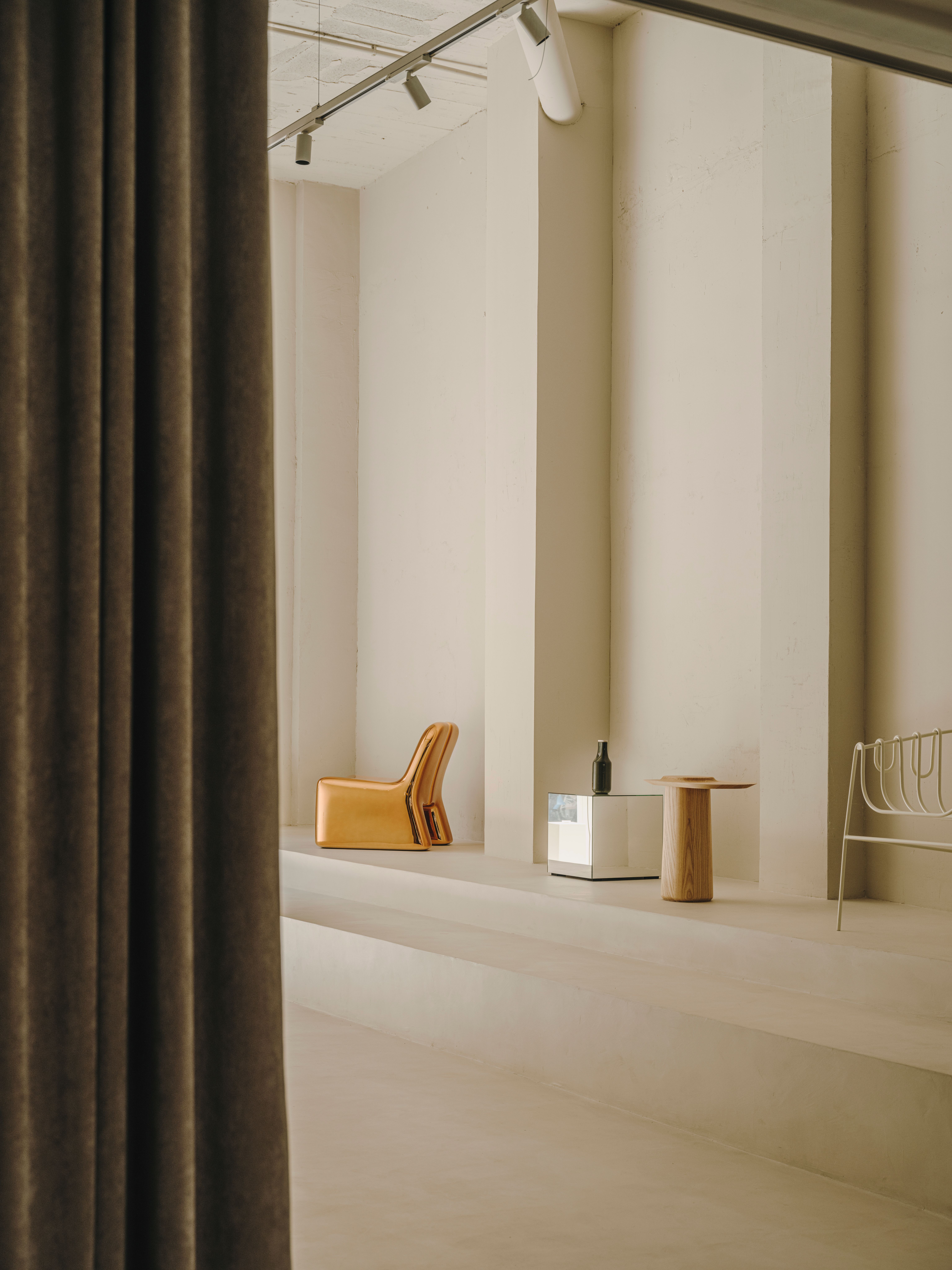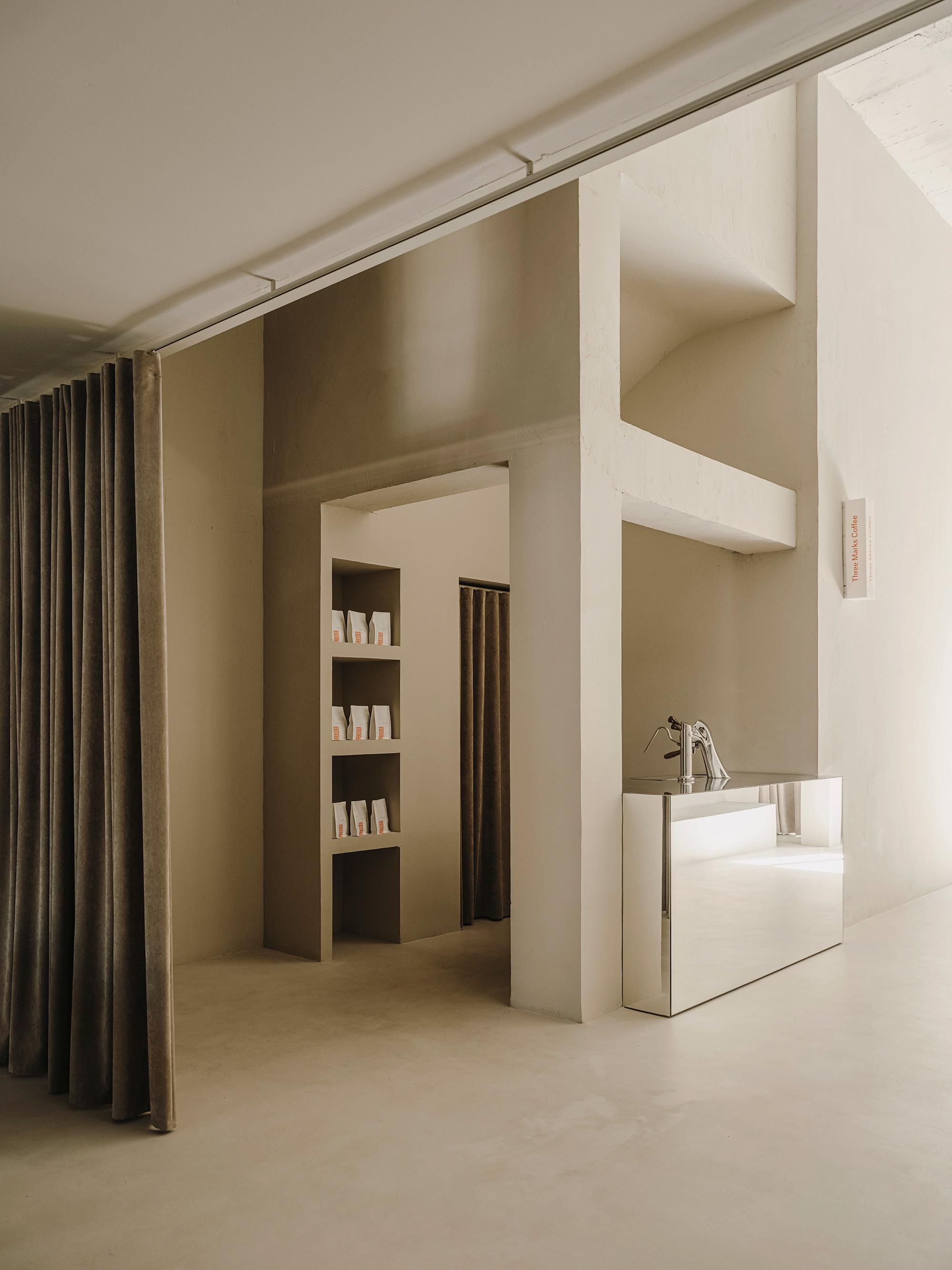 Upon entering the space, we find a large concrete step, which crosses the entire space until it reaches the end. An architectural element that in all its dimension, not only serves to exhibit objects but also to sit while waiting for the coffee, or to receive the public that comes to see a talk or exhibition given by a guest. To the right, and under a structural arch of the building, is the coffee space with a mirrored bar with a stainless steel countertop. In the public area, there is also a Three Marks Coffee corner, which makes every visit more pleasant and warm with its specialized coffee. The mezzanine can be closed with curtains both at the top and at the bottom, providing not only different degrees of privacy but also an element to divide the different areas.